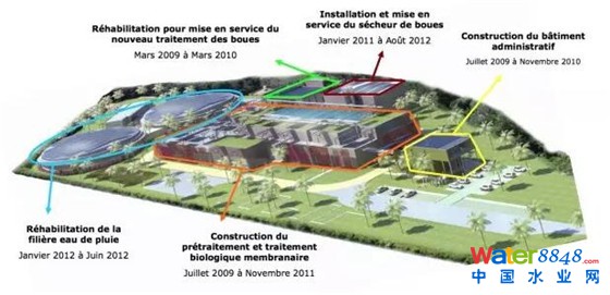 建于1977年的這座污水廠歷經(jīng)多年風(fēng)雨,已不能滿足歐盟的排放標(biāo)準(zhǔn)。相關(guān)的水務(wù)單位SIAUBC (Syndicat Intercommunal d’Assainissement Unifiédu Bassin Cannois)在2009年跟里昂水務(wù)Lyonnaise des Eaux (負(fù)責(zé)運(yùn)行)和它的合作伙伴SUEZ、Triverio和GTM(負(fù)責(zé)設(shè)計(jì)和建造)簽訂了協(xié)議,來(lái)建造和運(yùn)行一座新的污水廠,該廠命名為Aquaviva,將處理戛納地區(qū)30萬(wàn)的人口當(dāng)量(具體包括了Auribeau-sur-Siagne, Cannes, Le Cannet, Mandelieu-la Napoule, Mougins, Pégomas, La Roquette-sur-Siagne and Théoule-sur-Mer),設(shè)計(jì)能力為86000 m³/d。