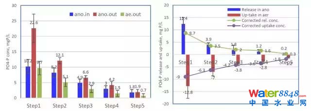▲左圖是樟宜再生水廠SFAS工藝不同階段的磷的濃度。誤差表示的是標(biāo)準(zhǔn)差。右圖是SFAS工藝不同階段的校正磷釋出和吸收的濃度。ano.in是缺氧區(qū)入口,ano.out是缺氧區(qū)出口,ae.out是好氧區(qū)出口