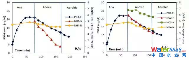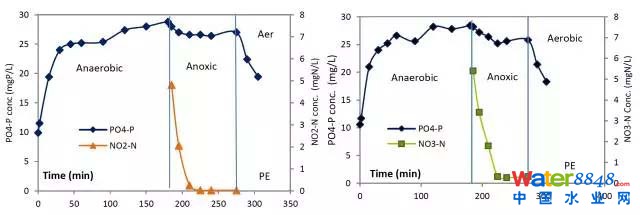 上圖顯示當(dāng)NO3-或NO2-耗完之后,缺氧區(qū)用初沉池出水的碳源作為電子供體時,PO4-P的吸收似乎也停止了。