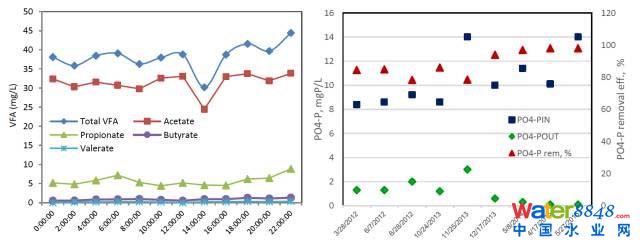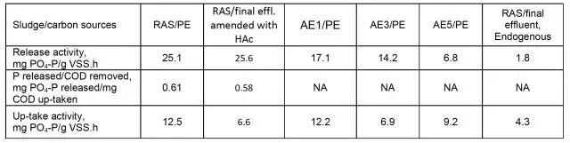 研究結(jié)果顯示,原位EBPR的效率和異位測定的磷的釋放和吸收的活性都高。磷的實際總?cè)コ蔬_88%。