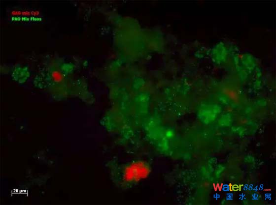 FISH原位熒光雜交成像顯示聚磷菌PAOs是優(yōu)勢菌群,活性污泥里的聚糖菌GAOs很少。