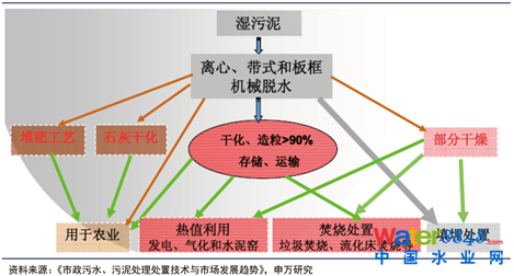 總體上看,污泥處理處置方案需要經(jīng)過預(yù)處理、污泥濃縮脫水、后端處置三個(gè)主要環(huán)節(jié)。其中,污泥預(yù)處理和脫水是可以說是各類后端處置方案都必須經(jīng)過的處理過程,而后端處置方案則需要根據(jù)多方面因素進(jìn)行綜合考量。