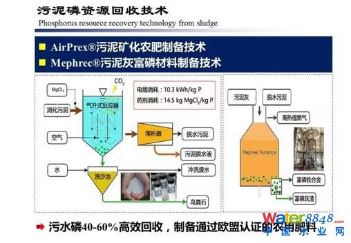 第二個(gè)技術(shù)是開展污泥磷資源回收技術(shù)。磷是不可再生的資源,污水中的磷回收可以彌補(bǔ)相當(dāng)大比例的磷產(chǎn)量,在德國(guó),兩個(gè)工藝正受到關(guān)注,分別是AirPrex®污泥礦化農(nóng)肥制備技術(shù)以及Mephrec®污泥灰富磷材料制備技術(shù)。