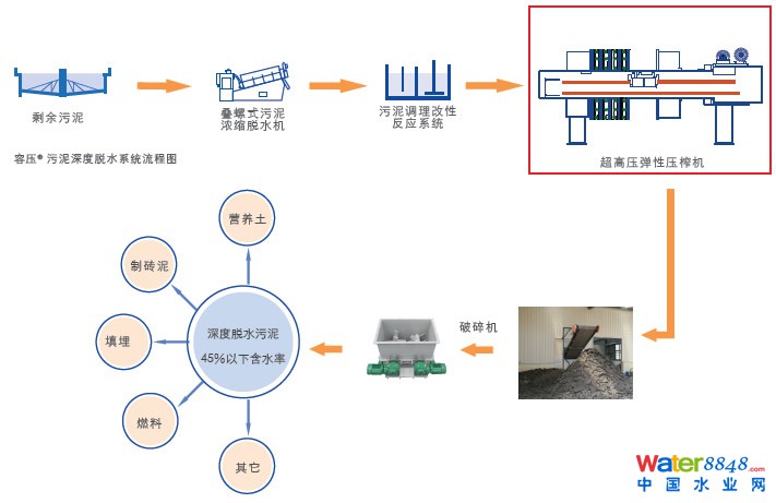本解決方案通過系統(tǒng)集成設(shè)備及工程設(shè)施,將原生污泥濃縮后進(jìn)行改性,然后泵入容壓彈性壓榨系統(tǒng)進(jìn)行深度脫水,使污泥含水率降至50%以下,經(jīng)處理后的污泥可直接進(jìn)行填埋、焚燒,也可用于綠化、制磚、燃料、有機肥等,最終實現(xiàn)污泥低費用資源化利用的目標(biāo)。深度脫水后污泥可繼續(xù)蒸發(fā)降至40-50%的含水率。