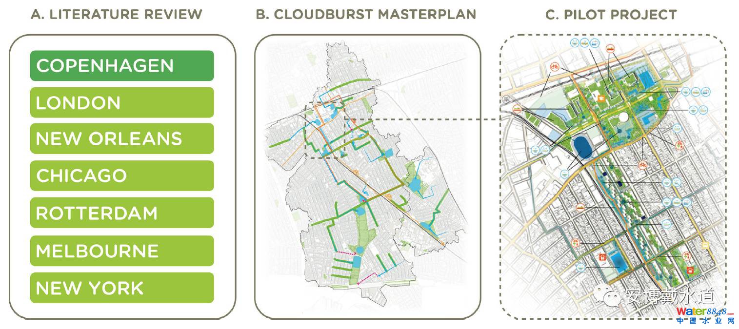 哥本哈根,一個(gè)擁有世界領(lǐng)先的暴雨管理系統(tǒng)的城市,用“暴雨計(jì)劃 Cloudburst”一詞來(lái)形榮降雨量在短時(shí)間內(nèi)達(dá)到一種極端的狀況。鑒于該研究建立在哥本哈根進(jìn)行暴雨管理的經(jīng)驗(yàn)基礎(chǔ)之上,因此在整個(gè)項(xiàng)目進(jìn)行過(guò)程中都沿用該詞。