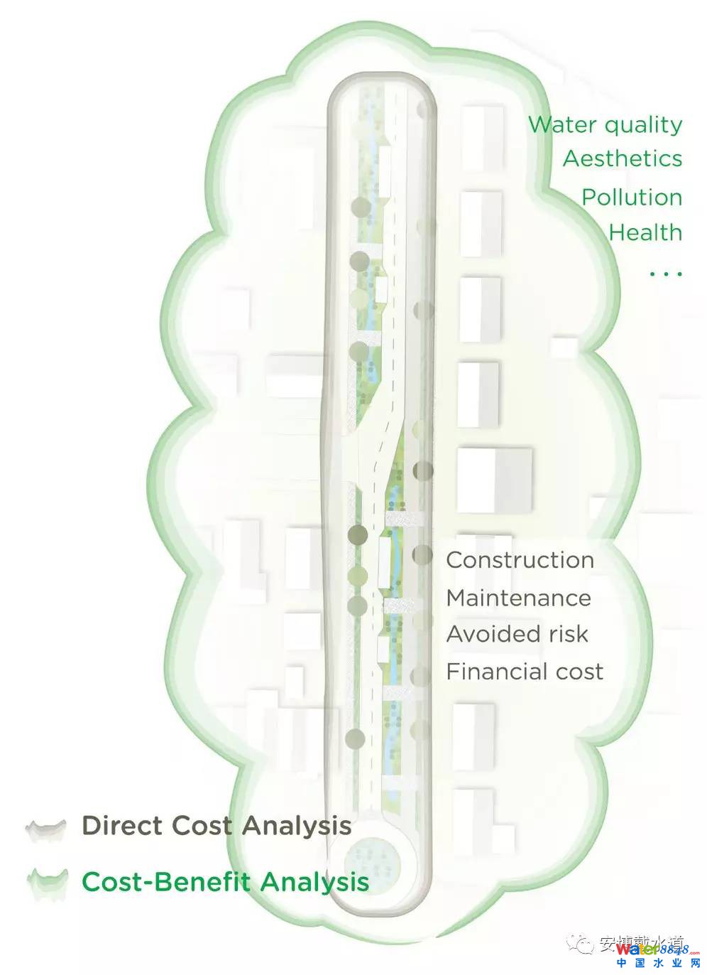 相關(guān)利益部門(mén)利用預(yù)先確定的用于滯留或輸送洪水的藍(lán)綠基礎(chǔ)設(shè)施元素繪制出自己的暴雨管理方法圖。藍(lán)綠基礎(chǔ)設(shè)施元素包含: