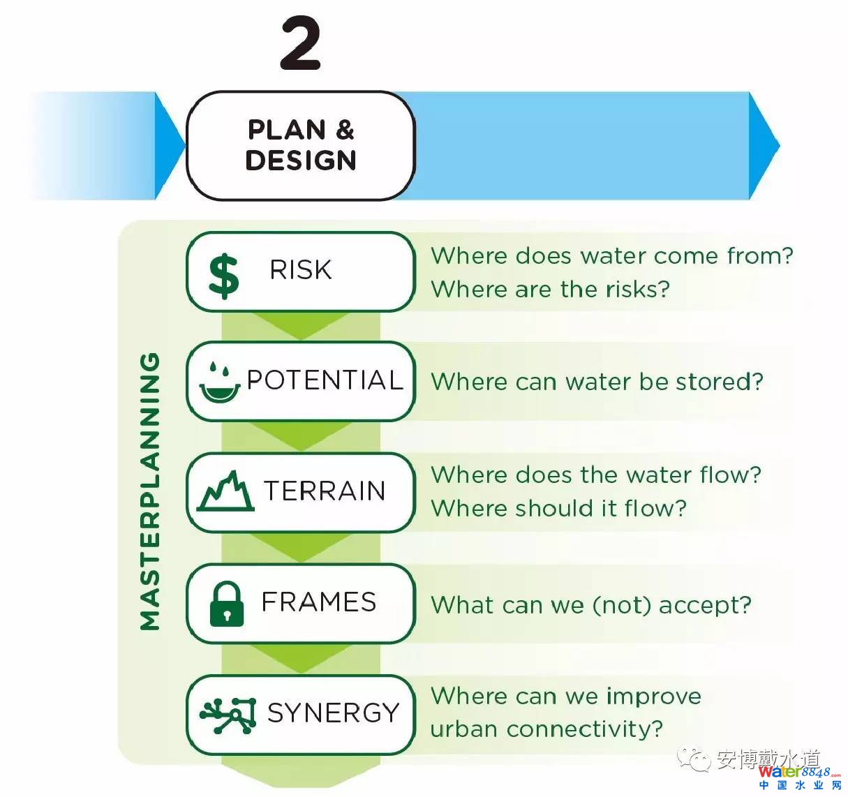 上圖總結(jié)了對(duì)形成總體規(guī)劃實(shí)際設(shè)計(jì)的綜合考慮。相關(guān)利益部門(mén)將仔細(xì)審查設(shè)計(jì)師和工程師調(diào)研和設(shè)計(jì)洪水流向、洪水存儲(chǔ)及輸送地帶的過(guò)程,從而對(duì)決策框架的制定或決策應(yīng)用給出限制或支持意見(jiàn),并最終確定該規(guī)劃與其它城市環(huán)境規(guī)劃的結(jié)合點(diǎn),如公園或自行車(chē)車(chē)道。相關(guān)利益部門(mén)可多次審查規(guī)劃設(shè)計(jì),每當(dāng)有新的發(fā)現(xiàn)時(shí)須隨時(shí)更新并改善設(shè)計(jì)。