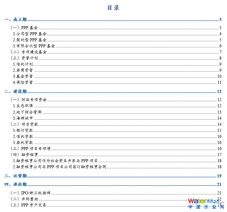 PPP不只是一種融資模式,但融資的確是PPP最基礎(chǔ)的一環(huán)。如果沒有資金,PPP所追求的管理和運營都將成為空談。隨著各部委連續(xù)的政策出臺,PPP的融資方式日益多元化。為了給資金供給方和需求方提供全面指引,本報告將系統(tǒng)梳理中國式PPP項目全流程的融資方式、資金來源、資金成本、資金期限及優(yōu)劣勢。具體包括:(1)成立期:PPP基金、專項建設(shè)基金、資管計劃。(2)建設(shè)期:財政專項資金、項目貸款、PPP項目專項債、融資租賃,運營期的資產(chǎn)證券化。(3)退出期:IPO/新三板掛牌、并購重組、PPP資產(chǎn)交易。