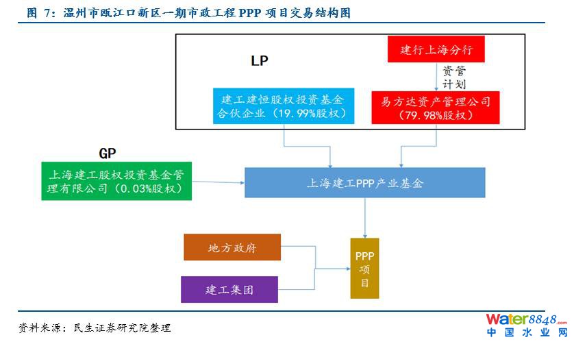 當(dāng)投資于PPP項目時,基金子公司的專項資管計劃較為常見。如上海建工集團股份有限公司與中國建設(shè)銀行股份有限公司上海市分行合作設(shè)立上海建工PPP產(chǎn)業(yè)基金,用于投資城市建設(shè)項目。首期募集基金將用于投資溫州市甌江口新區(qū)一期市政工程PPP項目。該基金由上海建工股權(quán)投資基金管理有限公司出資100萬元(0.03%份額)作為GP方;上海建工建恒股權(quán)投資基金合伙企業(yè)(有限合伙)出資80,000萬元,認(rèn)購19.99%有限合伙份額;易方達資產(chǎn)管理有限公司出資320,000萬元,認(rèn)購79.98%限合伙份額。其中,易方達資產(chǎn)管理有限公司系建行的資金通道,資金最終將由建行通過資管計劃投資于合伙企業(yè)。