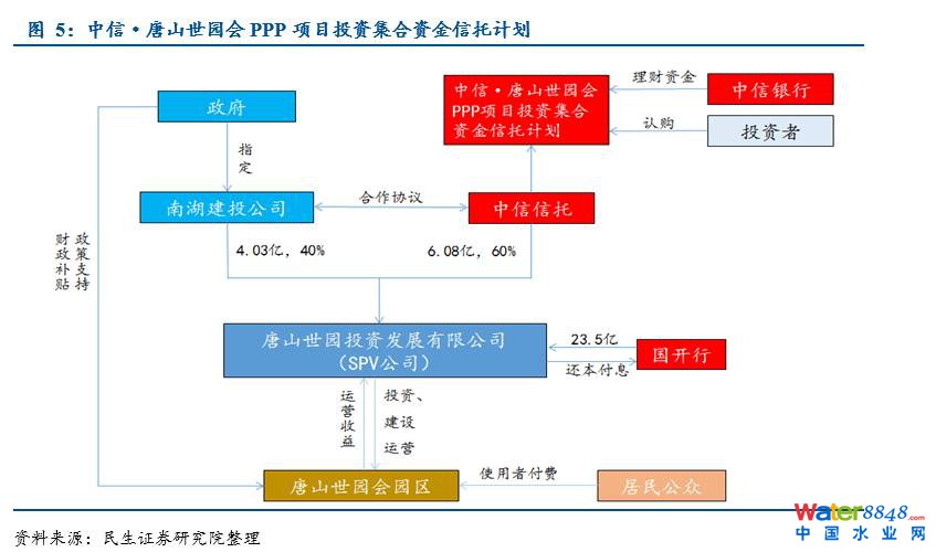 如首個信托公司參與的PPP項目——唐山世園會PPP項目總投資33.63億元,其中資本金10.13億元,政府出資4.05億元,占股40%,社會資本方中信信托發(fā)行“中信·唐山世園會PPP項目投資集合資金信托計劃”募集6.08億元,預(yù)期收益率為8%,占股60%,值得一提的是,信托計劃所募資金中一部分來自中信銀行的理財資金。 剩余23.5億元的項目貸由國開行解決。
