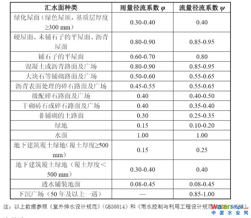 集水區(qū)綜合雨量徑流系數(shù)的計(jì)算按各地塊滲透性質(zhì)進(jìn)行面積加權(quán),具體參照表3-1。