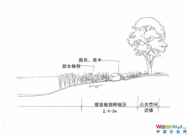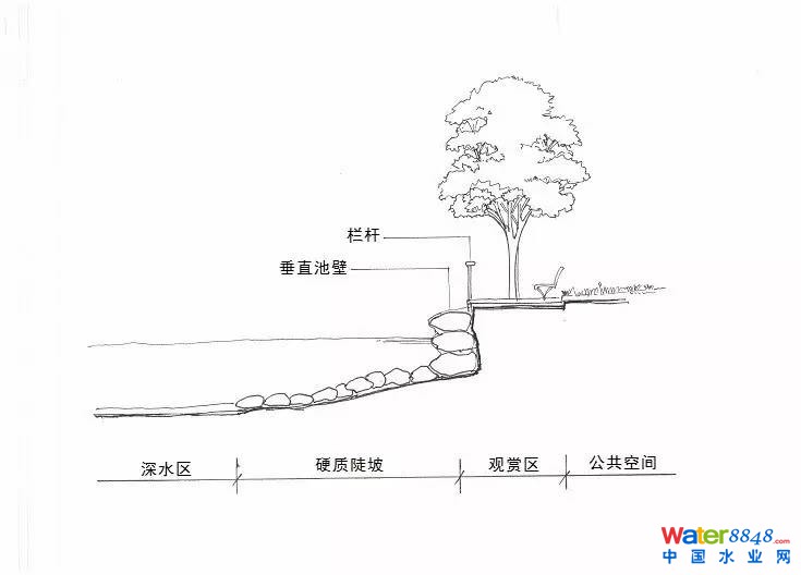 緩坡設(shè)計(jì)邊坡坡度小,一般取1:8-1:10,長(zhǎng)度一般取2.4-3m。坡上可以放置圓石及原木、種植挺水植物以營(yíng)造自然景觀。緩坡設(shè)計(jì)安全性高、觀賞性好,但占地面積稍大;陡坡設(shè)計(jì)中沉淀池池壁垂直,通過(guò)欄桿與外界隔開(kāi)。陡坡占地面積小,景觀效果稍差。