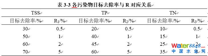 對(duì)于表面流人工濕地,濕地處理區(qū)面積可采用匯水區(qū)面積百分比法(WWAR)確定,在給定設(shè)計(jì)進(jìn)出水水質(zhì)的基礎(chǔ)上,根據(jù)各污染物目標(biāo)去除率,按表3-3可查得植草溝與集水區(qū)面積比R,一般取0.5%~5%。