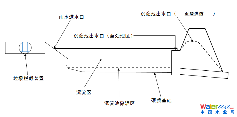 ⑤沉淀池雨水調(diào)蓄高度和溢流口(至溢洪道)標(biāo)高。