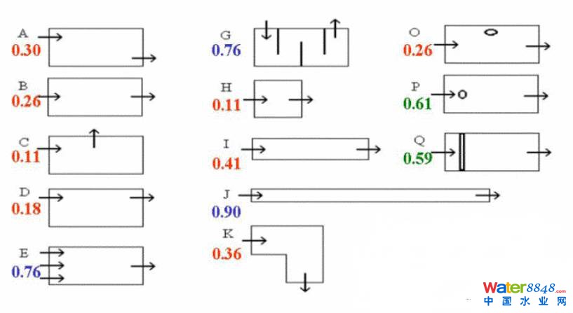 湍流系數(shù)與沉淀池水力效率λ有關(guān),n=1/(1-λ)。水力效率與沉淀池的長(zhǎng)寬比、出入口位置等有關(guān),增大水力效率的途徑包括提高長(zhǎng)寬比、多點(diǎn)進(jìn)水等。沉淀池水力效率應(yīng)不小于0.5,為此沉淀池長(zhǎng)寬比應(yīng)不小于3:1。圖3-4是常見(jiàn)沉淀池結(jié)構(gòu)下水力效率λ取值: