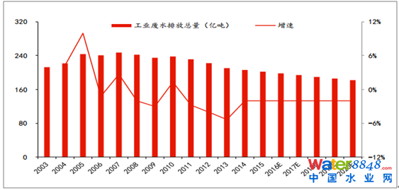 2003-2020年中國工業(yè)廢水排放總量及增速