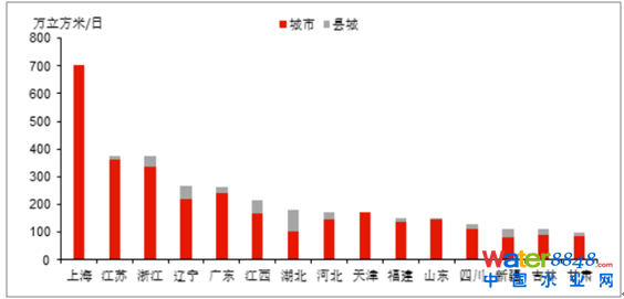 我國“十三五”城鎮(zhèn)污水處理規(guī)劃提標(biāo)改造規(guī)模前列省市