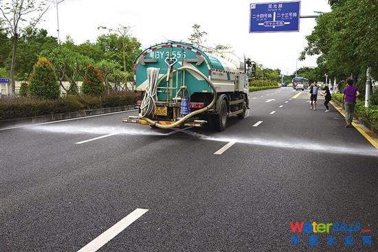 灑水車剛剛?cè)鲞^的路面沒有一點(diǎn)兒積水