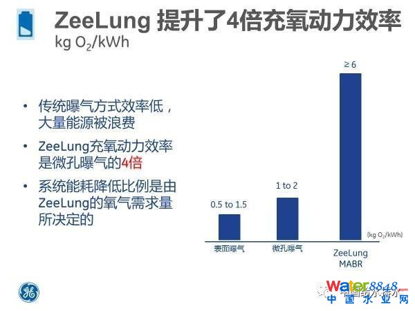 關(guān)于充氧動力效率,ZeeLung也遠遠高于傳統(tǒng)的表曝和微孔曝氣,典型ZeeLung可以做到微孔曝氣的四倍效果。同時由于ZeeLung的傳氧是從膜孔直接到生物膜界面,不存在傳統(tǒng)意義上的清水/污泥曝氣效率問題.整體來說ZeeLung理論效率可以是百分之百,所以基于這一點可以獲得高效的氧氣利用率,換句話說也就是降低了整體的運行電耗。針對A2O工藝來說,我們只需要將ZeeLung放在缺氧池,強化硝化和反硝化作用,后續(xù)的好氧生化池容積將會有30%到50%的處理水量余量。所以在現(xiàn)有占地不需要增加和傳統(tǒng)二沉池的回流比保持不變的條件下,通過MABR可以提高水質(zhì)同時提高水量。