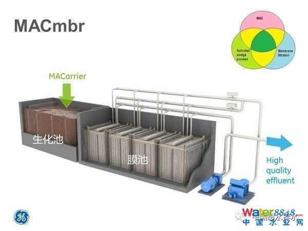 這種短流程工藝,實現(xiàn)MAC載體與MBR的完美耦合,實現(xiàn)1+1+1>3。MACmbr關(guān)鍵在于GE MBR采用的獨特的MAC載體特性、加強型ZeeWeed超濾膜、專利的曝氣及清洗工藝,在投加MAC載體的同時,不犧牲MBR通量和壽命等性能。相比其他的競爭工藝,在固定投資和運營成本上都更有優(yōu)勢。在典型ZeeWeed MBR系統(tǒng)上增加MAC投加系統(tǒng),系統(tǒng)生化調(diào)試時投加設(shè)定的劑量,在后續(xù)的運行中會根據(jù)污泥齡(SRT)和來水COD 的波動來調(diào)整補充的MAC投加量。在典型市政MBR系統(tǒng)中, MBR出水COD會小于30mg/l,且基本在20-30波動,所以要達到準III類或準II類水質(zhì)要求,MAC的日常投加量將是一個靈活的操作值,這有利于運行成本的最小化。而對于含有工業(yè)廢水的城鎮(zhèn)污水廠,要達到I級A或準IV類水質(zhì)要求,也可采用MACmbr實現(xiàn)這一目標。