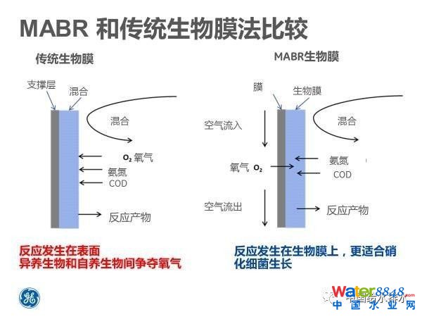 接下來看MABR。MABR英文全稱是Membrane Aerated Biofilm Reactor,直接翻譯很多人會理解成“膜曝氣生物膜反應(yīng)器”,但我們認為這并不能完全表達這個技術(shù)本身,所以我們把MABR稱為“膜傳氧生物膜反應(yīng)器”。為什么這樣說呢?我們的MABR產(chǎn)品的商標是ZeeLung,英文Lung是肺的意思,意味著我們用膜來進行傳氧。這實際上是用高效的氧氣擴散膜來實現(xiàn)氧的傳遞,即是一個無泡曝氣過程。通過中空纖維膜傳氧,然后在中空纖維膜上再長生物膜實現(xiàn)好氧生物處理。這與傳統(tǒng)的生物膜工藝是完全不同的:左邊傳統(tǒng)生物膜介質(zhì)上面長生物膜。氧氣和水中有機物和營養(yǎng)物質(zhì)從外進入到生物膜,從而存在異養(yǎng)菌和自養(yǎng)菌競爭的問題,整個生物膜單元是好氧環(huán)境。而在MABR工藝的生物膜中,氧氣和水中有機物、營養(yǎng)物質(zhì)是對向傳質(zhì)的,所以MABR的生物膜實際是一個硝化生物膜,即異養(yǎng)菌和自養(yǎng)菌不會產(chǎn)生沖突,這樣比較容易在整個生物膜界面上更好地進行硝化,而在外面混合液中進行反硝化,實現(xiàn)同步硝化反硝化。這實際上是兩種不同意義上的生物膜工藝技術(shù)。