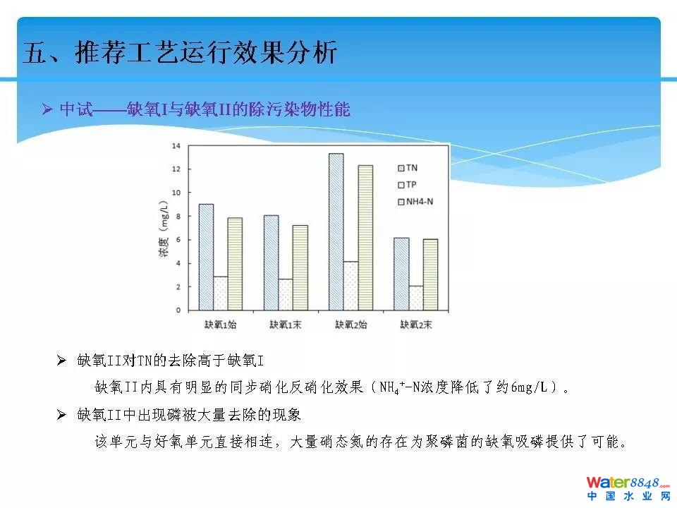 同時我們看到特別是增加的后缺氧,對總氮和氨都有很好去除效果。特別是后缺氧,第二個缺氧過程,也有一些同步硝化反硝化的作用,所以總氮和氨也有一些降低。在第二個缺氧段硝酸鹽有反硝化聚磷作用,對磷也起到一定的去除。