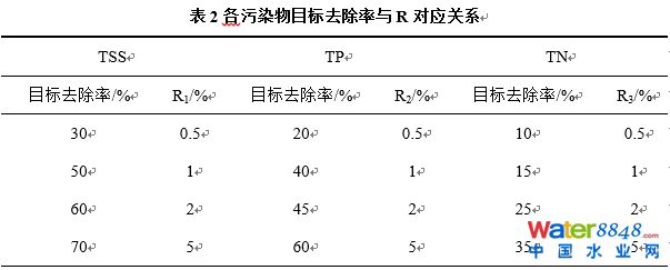 對于表面流人工濕地,濕地處理區(qū)面積可采用匯水區(qū)面積百分比法(WWAR)確定。根據(jù)各污染物目標(biāo)去除率,按表2可查得濕地處理區(qū)與集水區(qū)面積比R,一般取0.5%~5%。
