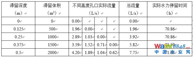 根據(jù)年徑流總量控制率85%的要求,查得設(shè)計(jì)降雨量為27.5mm,則處理區(qū)儲存容積V=10HφF=10*27.5*0.9*8=1980m³,則調(diào)蓄水深至少應(yīng)為V/a=1980/4000=0.495m,因此濕地調(diào)蓄水深取0.5m。