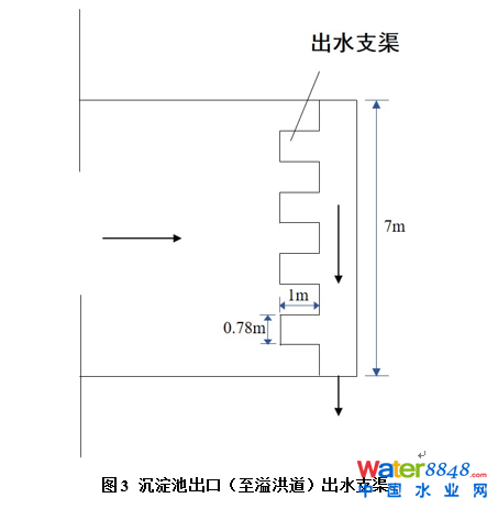 Lmin=2.55m明顯不滿足沉淀池長寬比應(yīng)不小于4的要求,結(jié)合場地實(shí)際情況,沉淀池長寬比取5:1,即沉淀池實(shí)際長度B定為34m,實(shí)際寬度B定為7m,深度H為2m。
