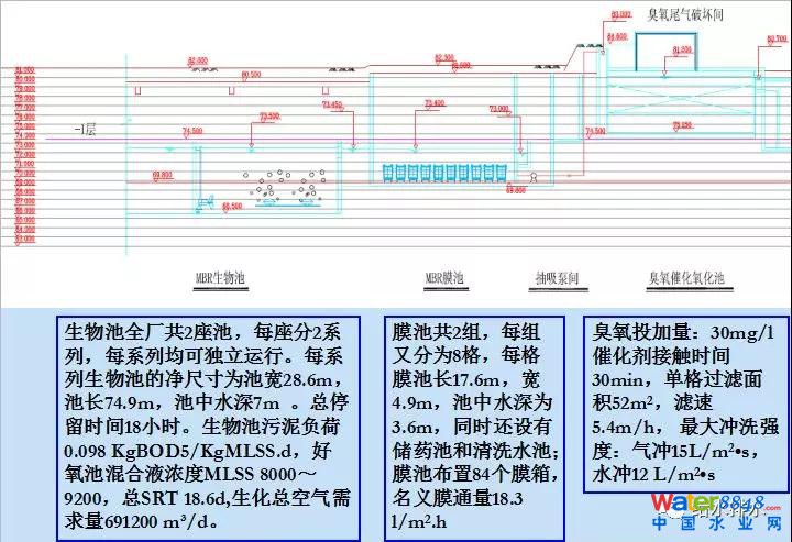 生物池部分,整個水利提留時間是18小時,為多級AO的形式。后面MBR的膜系統(tǒng),膜通量是18.3升/平方米/小時的膜通量。高級氧化接觸池臭氧投加最高按30毫克做的,空場接觸時間是30分鐘。濾速5米多一點(diǎn)。