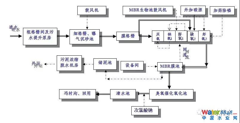 按照對各種主要出水指標(biāo)的工藝方案的分析,結(jié)合實(shí)際工程的特點(diǎn),按照現(xiàn)在社會影響普遍能夠接受的方式,設(shè)計(jì)了地下處理廠,采用MBR工藝,此工藝是多級AO+MBR+臭氧+高級氧化工藝流程。