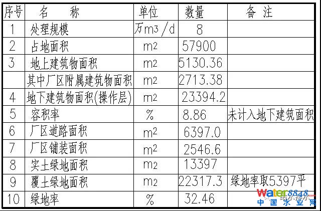 工程為8萬噸處理規(guī)模,占地面積5.79公頃,整個處理廠地下部分地下部分2.66公頃其他為地上部分。整個處理廠地下部分最深的地方埋深在16米,建好的地下部分,地下廠的上面有一米多的覆土,它的整體地方,整個廠的綠化率,如果不算廠的部分是32%的綠化率。