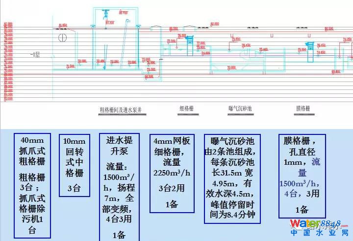 下面通過一個流程圖對參數(shù)做一個概述,抓爪式粗格柵40mm,有3臺,回轉(zhuǎn)式中格柵3臺,進(jìn)水提升泵是按照系數(shù)設(shè)計(jì),地下部分開始的細(xì)格柵是4毫米的,細(xì)格柵后面是曝氣沉砂池,它的峰值停留時間能夠在8分鐘以上。沉砂池后面是一毫米的孔狀膜格柵。