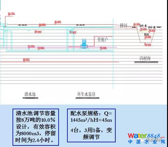 清水池按照8萬噸的10%做的設(shè)計(jì),最大停留時間是2.4小時,后面是配水泵,最終水可以排到村溝。