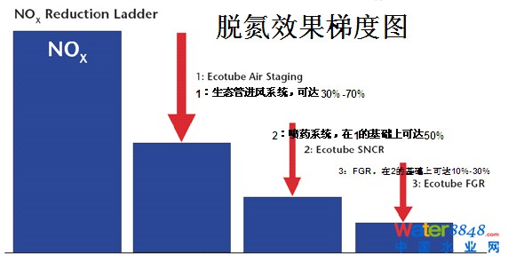 Ecotube 屬于低氮燃燒與煙氣脫硝技術(shù)相結(jié)合的技術(shù)類型,其技術(shù)特點(diǎn)如下:生態(tài)管系統(tǒng)是一種可改善燃燒工藝狀況,費(fèi)用-效益效果俱佳的工具,包括可收縮長(zhǎng)槍(生態(tài)管),它帶有可注入試劑的噴嘴。不同的試劑可通過噴嘴在高的壓力和速度下導(dǎo)入燃燒爐。生態(tài)管被置于爐內(nèi)的關(guān)鍵的位置上注入試劑,造成與燃燒產(chǎn)物激烈的混合,導(dǎo)致燃?xì)庵纬赏耆旌系耐牧鳡顟B(tài)。另外,當(dāng)從生態(tài)管中噴入氨試劑時(shí)可以脫氮,當(dāng)噴入石灰時(shí),這個(gè)系統(tǒng)可以脫硫。
