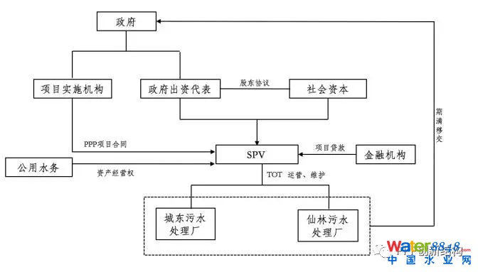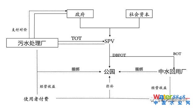 運(yùn)作模式說(shuō)明:將已建設(shè)完成、正在運(yùn)行中的污水處理廠作為存量資產(chǎn)轉(zhuǎn)讓給項(xiàng)目公司,同時(shí)將該地公益性質(zhì)的濕地公園與可以產(chǎn)生現(xiàn)金流的中水回用廠進(jìn)行捆綁打包,這樣可以用污水處理廠的污水處理費(fèi)收入與中水回用廠的中水收益彌補(bǔ)公益性濕地公園的建設(shè)、運(yùn)營(yíng)成本,減少政府的支出責(zé)任。