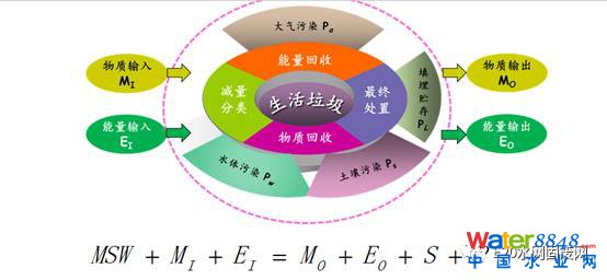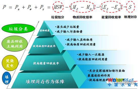 中國模式的確定,可以通過一些科學(xué)原理和技術(shù)原理來做一些判斷。垃圾處理是一個物質(zhì)能量的轉(zhuǎn)化過程,有輸入、有輸出,其中有一系列的反應(yīng)過程。在此過程中,垃圾量,物質(zhì)回收效率,能量回收效率,填埋封存量和污染物排放量之間的平衡關(guān)系可以用簡化的公式來表達,如下圖所示。