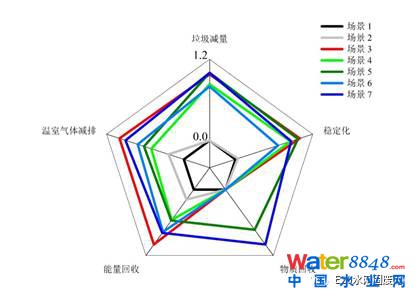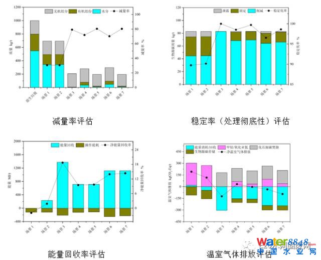 針對這七種情形,采用5個評估指標(biāo):減量化率;穩(wěn)定化率(處理徹底性);物質(zhì)回收;能量回收;溫室氣體減排。評估結(jié)果表明: