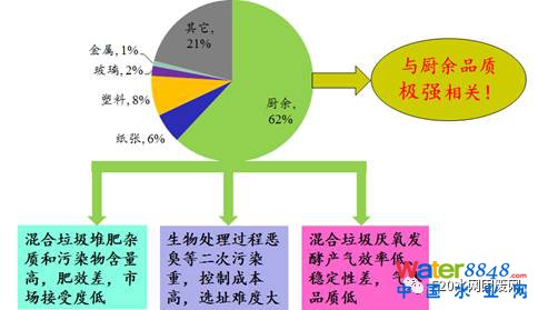 大家給予厚望的生物處理技術(shù)同樣面臨挑戰(zhàn)。源頭分類很難,分類效果差,依賴二次集中分選,增加了處理成本,影響系統(tǒng)穩(wěn)定運行及產(chǎn)品品質(zhì);臭味控制難,進料、分選、堆肥等環(huán)節(jié)惡臭釋放量大成分復(fù)雜,控制成本高占地面積大;土地利用難,堆肥及沼渣沼液土地利用存在諸多限制,市場接受度低,許多情況下仍然需要當(dāng)做廢物處理;持續(xù)盈利難,產(chǎn)品非標(biāo)準化產(chǎn)品,品質(zhì)相對較低,附加值較低,盈利模式不清晰。這些問題產(chǎn)生的根源與大量的廚余垃圾有著極強的關(guān)系。