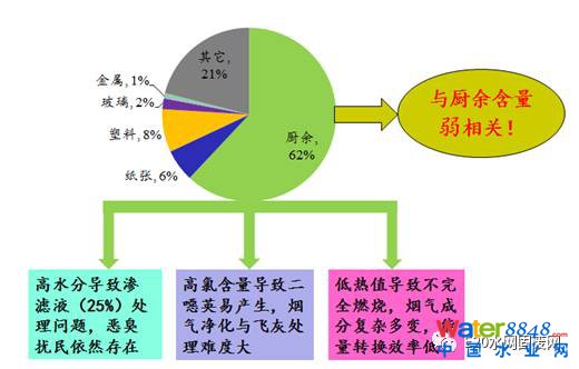 分技術(shù)路線來看,衛(wèi)生填埋方面,由于占地面積大,在很多城市的選址越來越難;由于滲濾液產(chǎn)生量大,污染負荷高,處理標(biāo)準嚴、難度大、成本高;惡臭污染嚴重,控制難度大;填埋產(chǎn)氣不穩(wěn)定,甲烷含量低,收集利用難度大,溫室氣體排放量大;填埋場積水嚴重,水位雍高,安全隱患大。這些問題產(chǎn)生的根源在于我國生活垃圾的高水分、高廚余的特點,項目運營得再好,很多問題也是不可避免的。