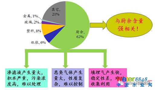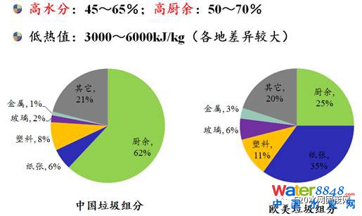 從如下兩張圖中可以看到,我國垃圾最主要的構(gòu)成部分是廚余垃圾,超過60%,有的地區(qū)甚至達到70%-80%。對比歐美國家,他們最主要的垃圾是紙張,廚余垃圾只占到25%。因為這樣的差異,我國垃圾的最大特點就是濕,含水率很高;另一特點是臭,容易腐爛降解。