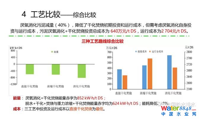最后,把我們推薦工藝與重力濃縮后再機(jī)械脫水、干化焚燒工藝,以及傳統(tǒng)厭氧消化后干化焚燒工藝進(jìn)行一下比較。直接干化焚燒能量消耗是最小的。從投資和運(yùn)行成本來看,無論是投資成本、運(yùn)行費(fèi)用,在這三個(gè)比較中都是最低的。