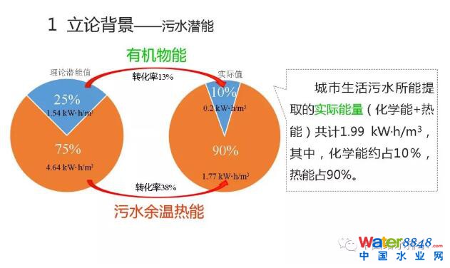 今天我的發(fā)言既與碳中和有關(guān)也跟磷回收有關(guān)。那么,關(guān)于碳中和談得是污水處理的耗能過程,有機(jī)物及氮磷去除要消耗能量,碳中和即需要從污水處理廠或污水里找到能量去彌補(bǔ)能耗。對(duì)此,大家更多會(huì)想到剩余污泥里有大量含能有機(jī)物,這也是我們搞污水處理人所關(guān)注的,所以,污泥厭氧消化從傳統(tǒng)到現(xiàn)在,以至于有更多的人前赴后繼對(duì)厭氧消化進(jìn)行優(yōu)化提高其能量轉(zhuǎn)化效率,包括前處理,比如說,高碑店現(xiàn)在的熱水解,就是希望最大化把污泥中的有機(jī)能源轉(zhuǎn)化出來。但是,我們搞污水處理的人忽視了一個(gè)問題,就是說除了有機(jī)物形成的化學(xué)能以外,還有大量污水中的余溫?zé)崮。?qǐng)大家看這個(gè)圖,有機(jī)物中的化學(xué)能與污水中余溫?zé)崮芟啾,很少、很少。理論上一個(gè)75%,一個(gè)25%。也就是說污泥中有機(jī)物的化學(xué)能只占整個(gè)污水中潛能的25%,75%是熱能。我們給大家先看這樣一個(gè)概念,也就是說我們所關(guān)注的厭氧消化轉(zhuǎn)化的能源占整個(gè)污水中的潛能,理論值是25%。那么這25%的有機(jī)能源又能轉(zhuǎn)化多少呢?顯然這是個(gè)理論值,不可能100%轉(zhuǎn)化。