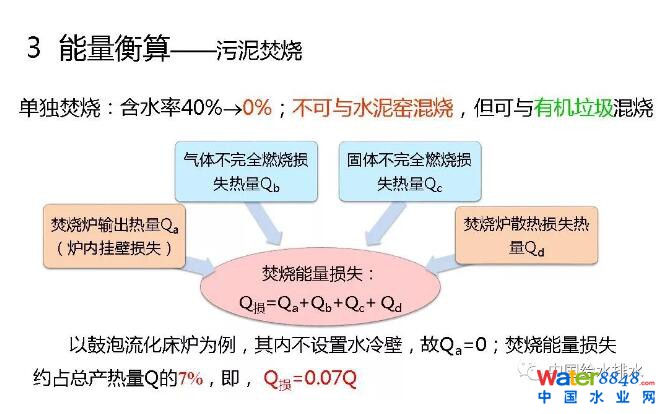 單獨(dú)焚燒,含水率40%~0%。不可與水泥窯混燒,但可與有機(jī)垃圾混燒。焚燒有熱量損失,焚燒爐輸出的熱量,比如說爐內(nèi)壁掛損失、焚燒爐散熱損失等等,所有損失加在一起,以鼓泡流化床為例,大概就是7%,即占焚燒產(chǎn)生熱量的7%,這都是有文獻(xiàn)可查的。污泥焚燒也產(chǎn)生熱量,這個(gè)熱量主要跟有機(jī)質(zhì)有關(guān),這個(gè)是計(jì)算公式。我們國家有機(jī)質(zhì)含量比較低,在30%~60%的范圍,我們計(jì)算時(shí)取污泥有機(jī)質(zhì)含量中間值53%,北京大概是60%。計(jì)算污泥燃燒熱為1.2GJ/kgDS。這是不同國家污泥燃燒值,中國大概在個(gè)范圍,平均是11850kJ/kgDS。我們的計(jì)算跟這個(gè)1.185GJ/kgDS基本接近,這都是從文獻(xiàn)來的數(shù)據(jù)。這樣經(jīng)過計(jì)算以后,污泥脫水+干化+焚燒,脫水要輸入能量,干化要輸入能量,焚燒產(chǎn)生能量;最后的結(jié)果會(huì)發(fā)現(xiàn)總耗能是3091度電每噸干固體。總產(chǎn)能11.1GJ,利用熱電聯(lián)產(chǎn)轉(zhuǎn)換為電當(dāng)量為2467度電。也就是說整個(gè)工藝的能量輸入為624度電。下面是詳細(xì)的計(jì)算表,不講了。