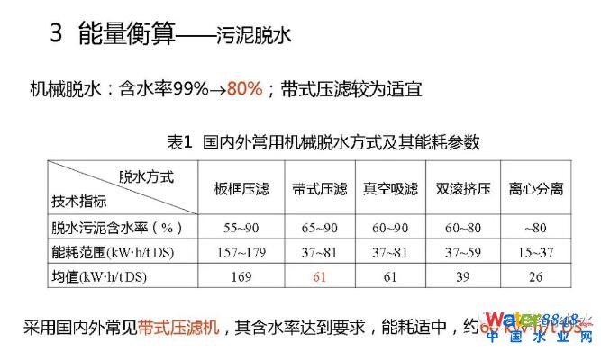 接下來我們看一下計(jì)算結(jié)果。大家知道,機(jī)械脫水有各種各樣的方法,99%~80%,這里列了很多技術(shù)與設(shè)備,我也不一一匯報(bào)了。常見的是帶式壓濾機(jī),能達(dá)到80%含水率的要求,所以,我們就以帶式壓濾機(jī)為例進(jìn)行計(jì)算,大概耗能折合成干固體每噸是60千瓦小時(shí),即,60度電。熱干化,也就是從80%~40%,我知道搞干化設(shè)備的人有很多,到40%以后基本上就可以自持燃燒了。干化的時(shí)候輸入熱能進(jìn)行蒸發(fā),所需熱量一個(gè)是用于污泥中水分升溫繼而蒸發(fā)的熱量,還有就是污泥升溫的熱量。