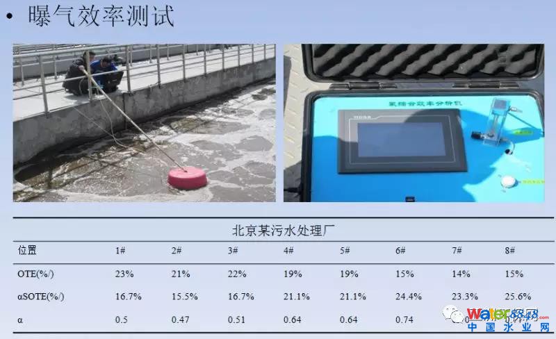 實(shí)際處理能力評(píng)估需要用到一些方法,這些方法一般包括開(kāi)會(huì)討論分析、全廠(chǎng)實(shí)際測(cè)試、工藝模擬分析。開(kāi)會(huì)討論分析通常是相關(guān)方坐在一起討論,這種方式天然上來(lái)說(shuō)是比較保守的,因?yàn)樵跊](méi)有確切數(shù)據(jù)和依據(jù)的情況下,人都是保守的,只能憑經(jīng)驗(yàn)。第二種方法是實(shí)際測(cè)試,實(shí)際測(cè)試包括沉淀池負(fù)荷測(cè)試、氧轉(zhuǎn)移測(cè)試、示蹤劑測(cè)試以及在線(xiàn)監(jiān)測(cè)等,實(shí)際測(cè)試的好處是因地制宜,找出關(guān)鍵參數(shù),明確制約瓶頸。其中,負(fù)荷測(cè)試包括預(yù)處理、曝氣池、沉淀池、污泥脫水單元等方面的測(cè)試,需要明確各個(gè)單元的實(shí)際處理能力,當(dāng)然測(cè)試期間不能影響出水水質(zhì)。這里舉一個(gè)曝氣效率方面測(cè)試的例子,大家知道α值是混合液中氧轉(zhuǎn)移效率與清水中氧轉(zhuǎn)移效率之比,是曝氣計(jì)算過(guò)程的一個(gè)關(guān)鍵參數(shù),國(guó)內(nèi)設(shè)計(jì)規(guī)范是0.8-0.85,美國(guó)在80年代之前也是基本采用0.8,但實(shí)際運(yùn)行中發(fā)現(xiàn)這個(gè)值差別較大,α值和泥齡、水質(zhì)等參數(shù)有關(guān)系,低的能到0.3。實(shí)際上,最為可靠的方法是用尾氣法測(cè)試獲得實(shí)際的α值,這是我們?cè)谝粋(gè)污水廠(chǎng)正在做的尾氣法測(cè)試的照片,美國(guó)已經(jīng)有數(shù)百個(gè)污水廠(chǎng)采用了這種方法。通過(guò)這種方法獲得真實(shí)的參數(shù)為設(shè)備選型提供更加科學(xué)合理的依據(jù)。
