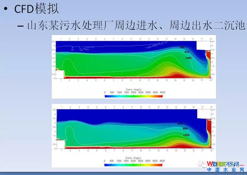 這是山東某污水處理廠(chǎng)的周邊進(jìn)水、周邊出水的二沉池的CFD模擬,通過(guò)模擬發(fā)現(xiàn),進(jìn)水裙板的高度對(duì)二沉池的流態(tài)有重要的影響,加長(zhǎng)了裙板以后,出水SS就會(huì)降低很多,把污泥層的界面也降低很多。