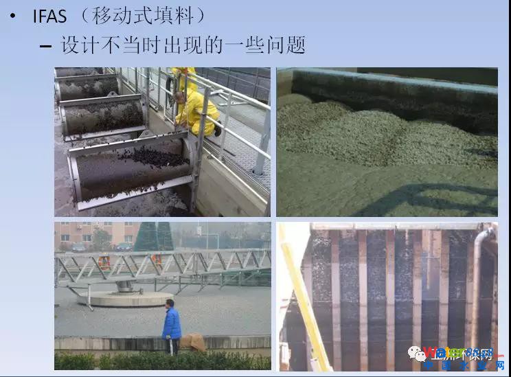 移動(dòng)式填料IFAS工藝的優(yōu)點(diǎn)是填料的比表面積大,但設(shè)計(jì)不當(dāng)會(huì)出現(xiàn)很多問(wèn)題,比如填料流失、填料堵塞篩網(wǎng)、填料在池內(nèi)角落堆積、曝氣設(shè)置的問(wèn)題等等,這些方面涉及很多工程細(xì)節(jié),主要是生物池水力流態(tài)方面的問(wèn)題,需要格外注意。