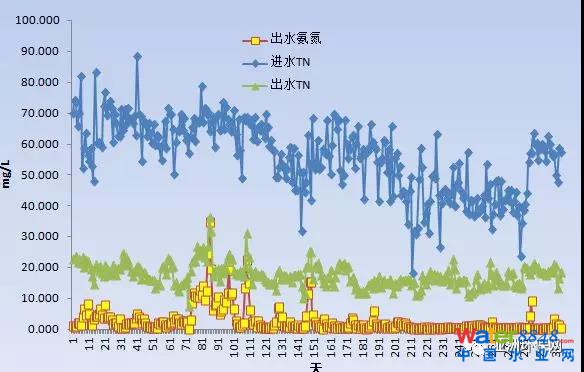 A2O是最常用的工藝,受制于實(shí)際內(nèi)回流比的影響,即使在碳源充足的情況下,A2O工藝的脫氮率最高一般就在70%左右。所以如果進(jìn)水TN小于50mg/L,出水TN達(dá)到15mg/L是可以的,但要求達(dá)到10mg/L以下是非常困難的。這是一個(gè)大型A2O工藝的污水處理廠(chǎng)進(jìn)出水TN曲線(xiàn)圖,這個(gè)廠(chǎng)的進(jìn)水碳源很充足,脫氮率一般就在70%左右。