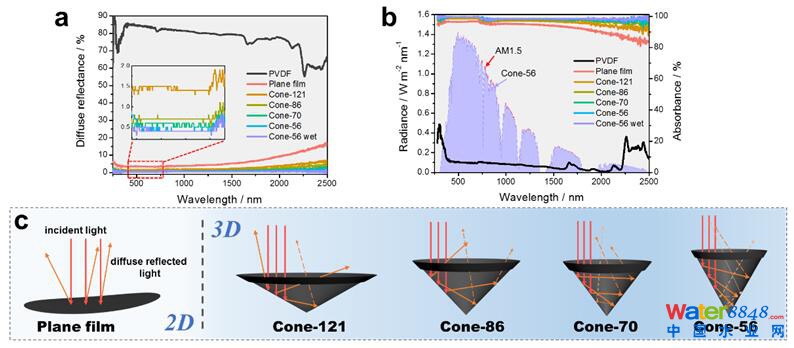 圖2. 3D空心錐形膜與2D平面膜樣品的漫反射性能對比(a)及吸光率對比(b),多步反射過程示意圖(c)